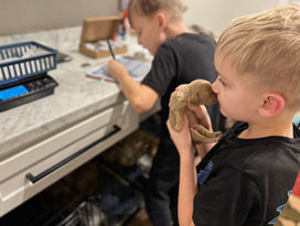 Druing the 3rd week / Transitional Period, we place an object in the box and the let the pups explore this novel item at their own pace/comfort level. Our goal is not to overstimulate the pups, but to pique their curiosity and interest (watching that they don't get stressed or overwhelmed).