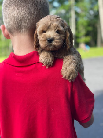 Noel's Cockapoo puppies are walking and motoring about - with eyes open they can easly find momma and get excited when they hear our voices or see us. Growing and changing each day - they can peek over the edge of their whelping box to see where momma is (if not in with them)....one little monkey (who shall remain nameless 😉) has even busted out only to realize being out and alone wasn't as fun as they thought it would be (don't worry, we are never far and scooped up said puppy and after some cuddles they were placed back in with their littermates).