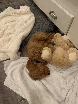 Teddy has been a true angel in our lives. I simply cannot imagine our lives without the little bundle of joy. He is the goofiest, most loving, and smartest little pup I have ever met. He loves to learn and at 4 months has mastered sit, down, paw, high five, stay, leave it, drop it, place, ringing a bell to go out, roll over, and spin with no formal training. He was extremely easy to potty train and has had no accidents for over a month. He is excellent with other dogs and has regular play dates several times a week with another dog in our building. He also is the BEST with people of all ages, old, young, babies, you name it. He is a lover. We get stopped several times a day by people asking what breed he is/where he's from. We went with a cockapoo for their temperament of being funny but also snuggly and sensitive and Teddy is all that and more.